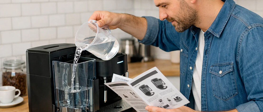 Перед приготовлением напитков промойте систему горячей водой, установите жесткость воды в меню и используйте только фильтрованную воду. Первые 2–3 пролива лучше сделать без кофе, чтобы прогреть систему.