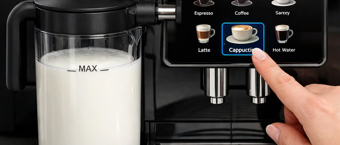 Молоко подаётся через встроенный кувшин или трубку. Машина сама регулирует подачу пара и воздуха, затем добавляет молоко в чашку.